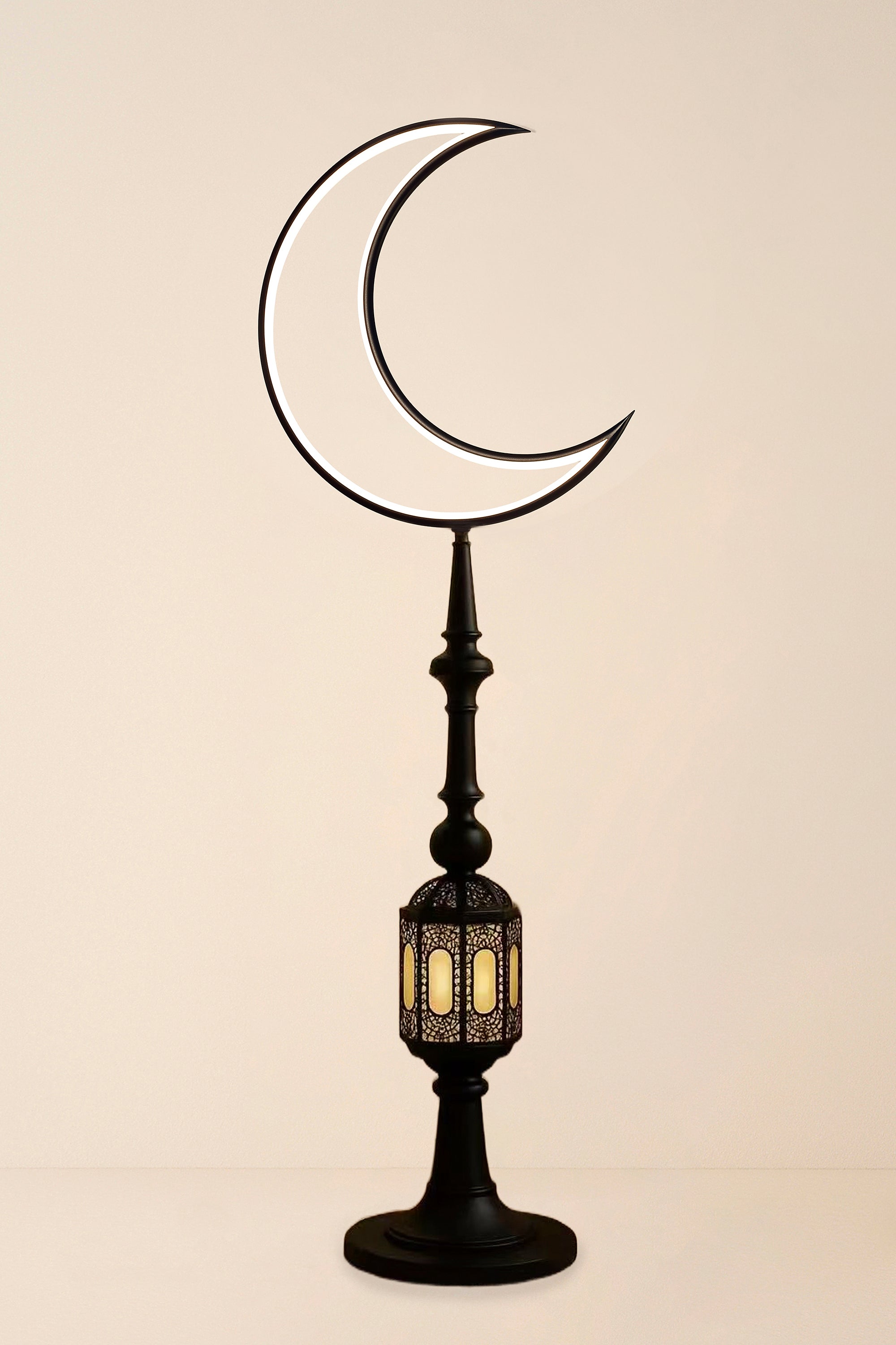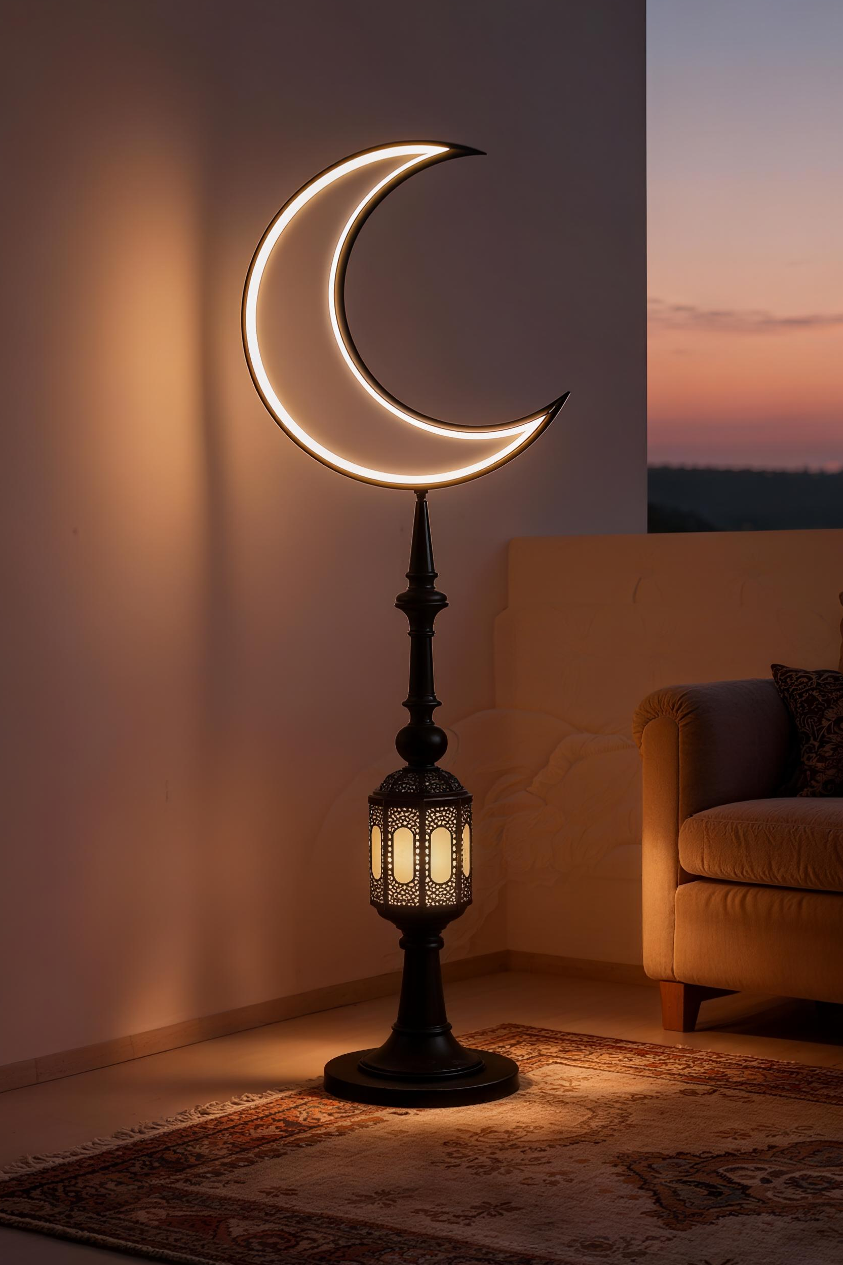 Designed around the sacred crescent, this floor lamp embodies tranquility, faith, and renewal, casting a gentle glow that transforms any space into a sanctuary of peace Its sleek crescent LED design rises gracefully from a black arabesque lantern base, inspired by traditional Middle Eastern motifs. The dual light source—soft lantern warmth below and radiant crescent light above—creates a layered ambiance ideal for Ramadan evenings, Eid gatherings, or year-round home décor.