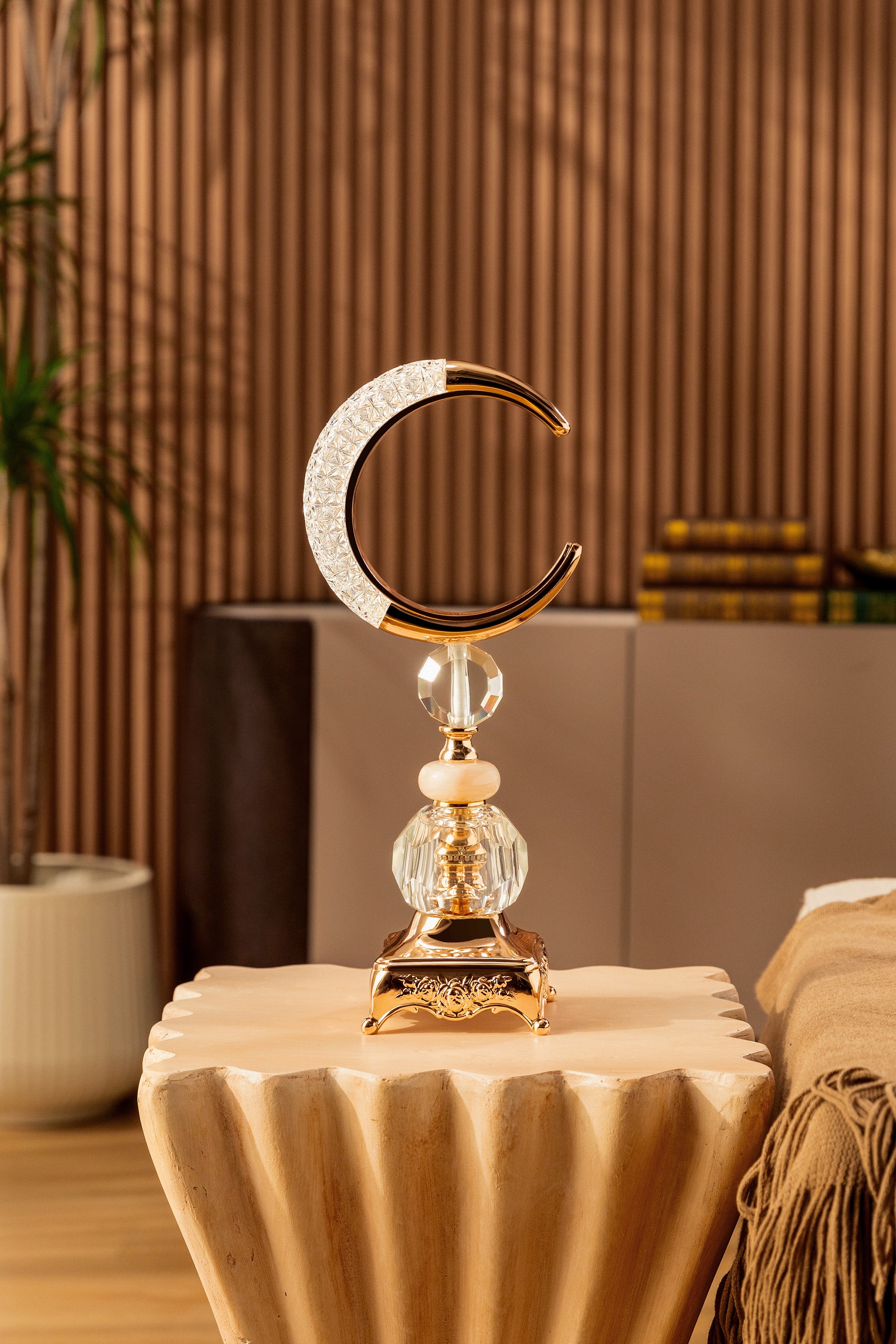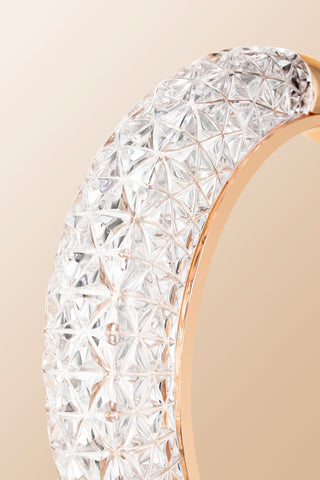 The combination of faceted crystal and polished metal detailing creates a luxurious, light-reflecting presence that feels refined even when unlit.