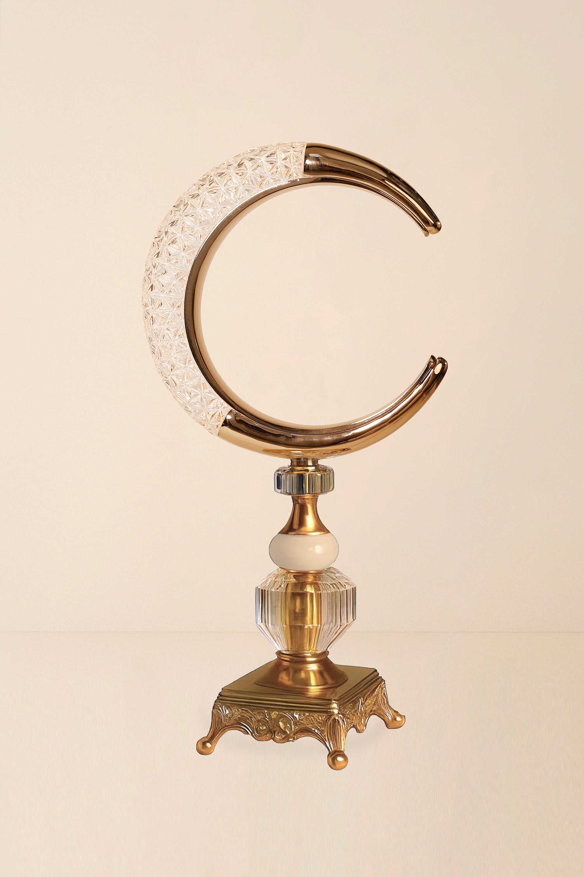 The base combines crystal clarity and gold detailing, inspired by traditional Islamic architecture and Moroccan patterns. Every curve, every shimmer evokes the tranquil beauty of the holy month—making it not just a decorative piece, but a spiritual centerpiece for your home, majlis, or gifting collection.