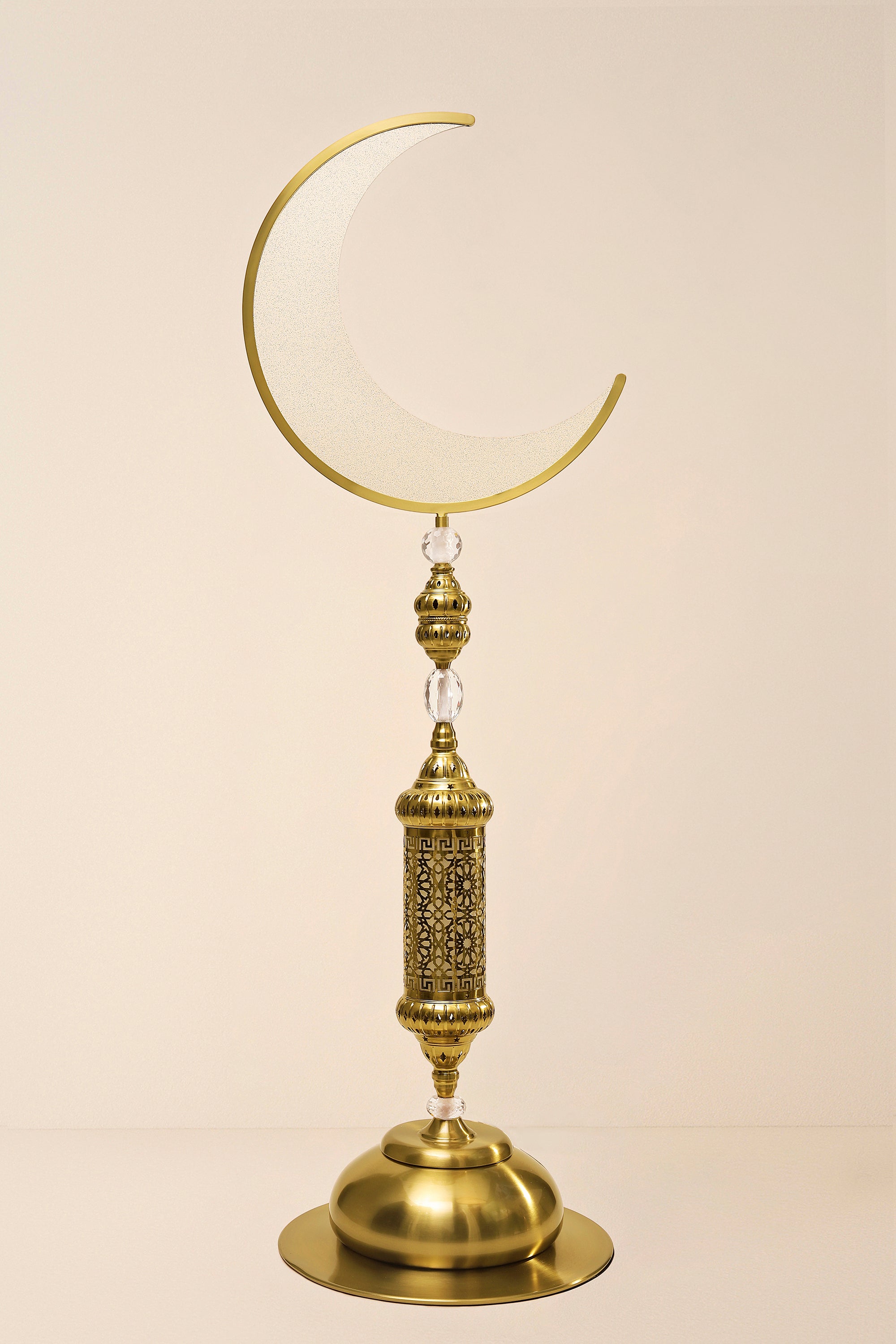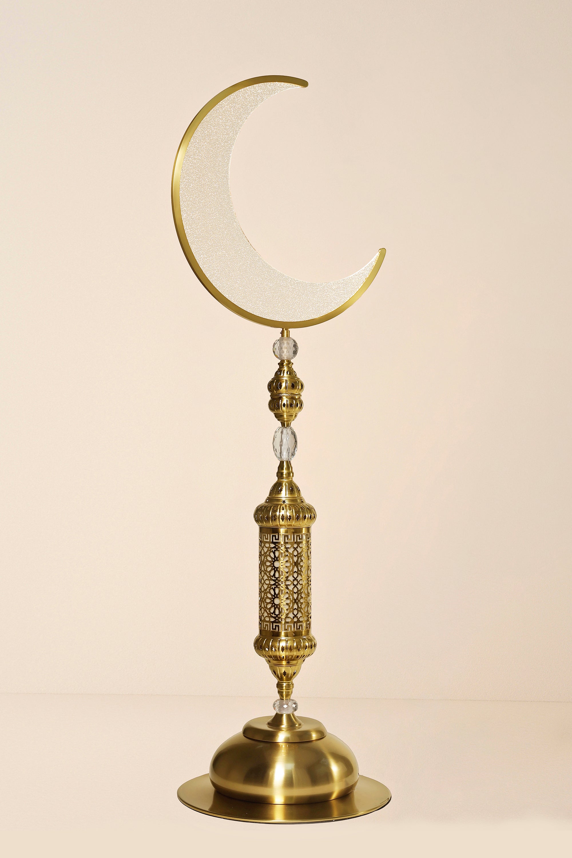 Add a touch of refined luxury to your interior with the Floor Hilal Lamp, a tall, elegant lighting piece designed for modern sophistication. Crafted from premium aluminum, iron, crystal, and acrylic, its copper-gold finish radiates warmth and opulence. The lamp features a sophisticated, intricate pattern that captures light beautifully, creating a striking centerpiece for your living room, bedroom, or office. Minimalist in form yet rich in detail, this lamp combines contemporary design with luxurious materials, offering both style and ambient illumination for any upscale space.
