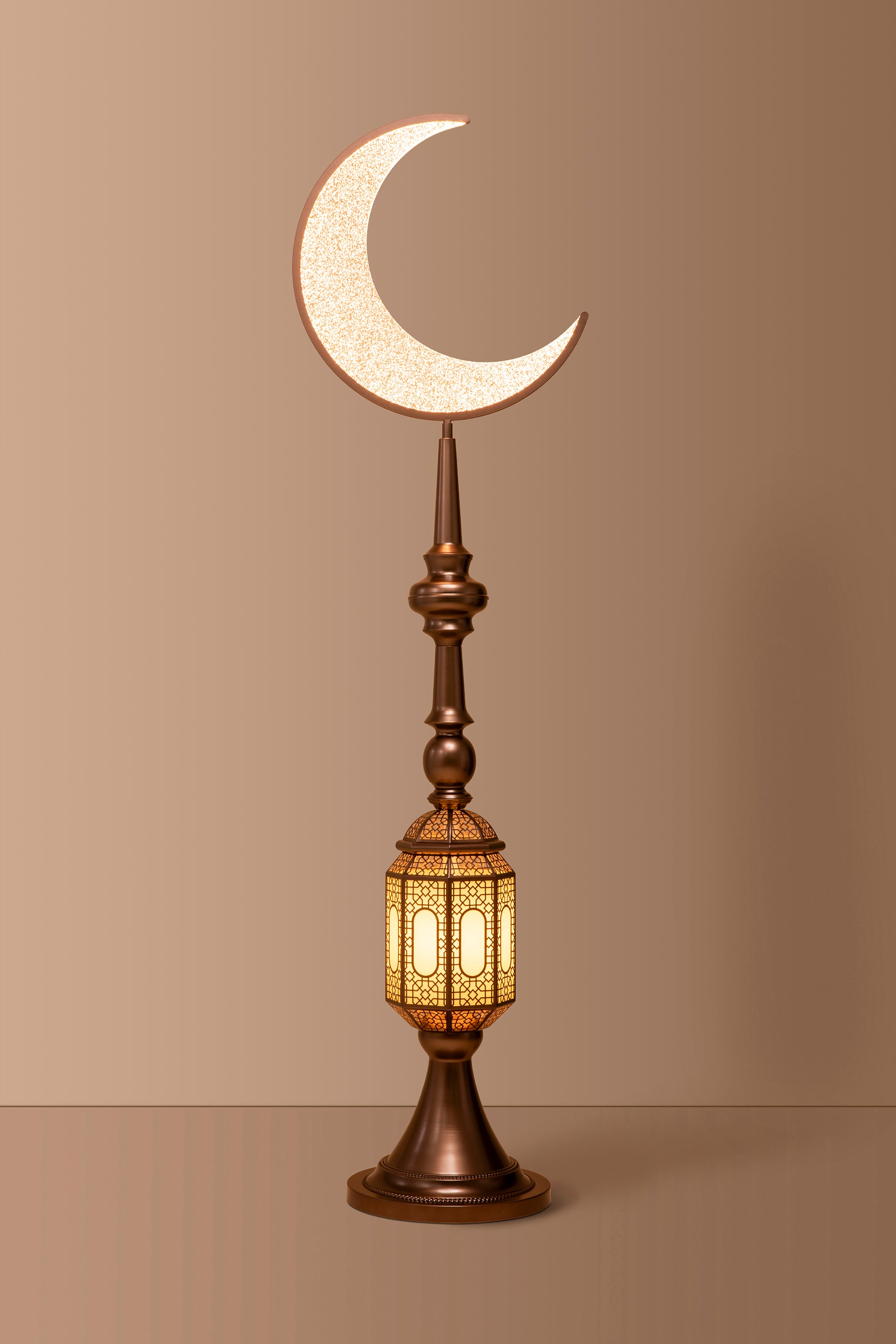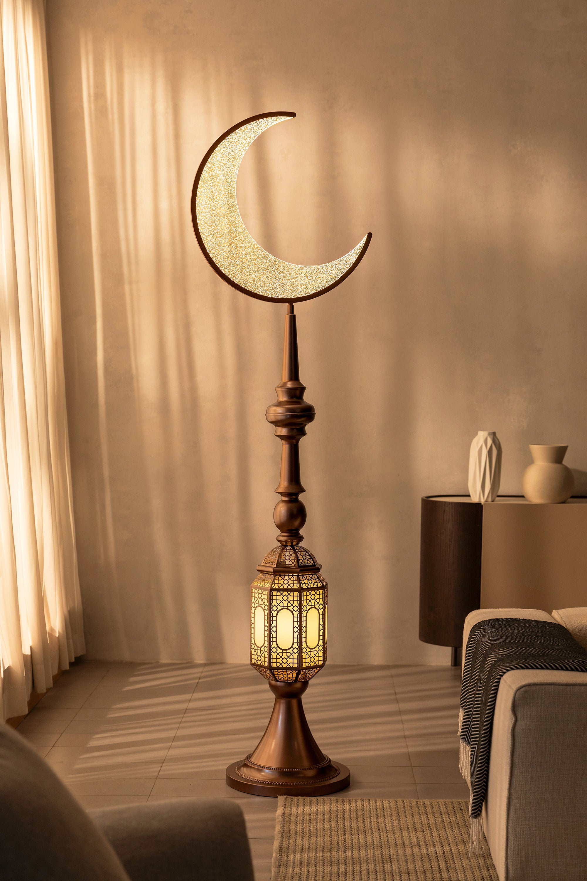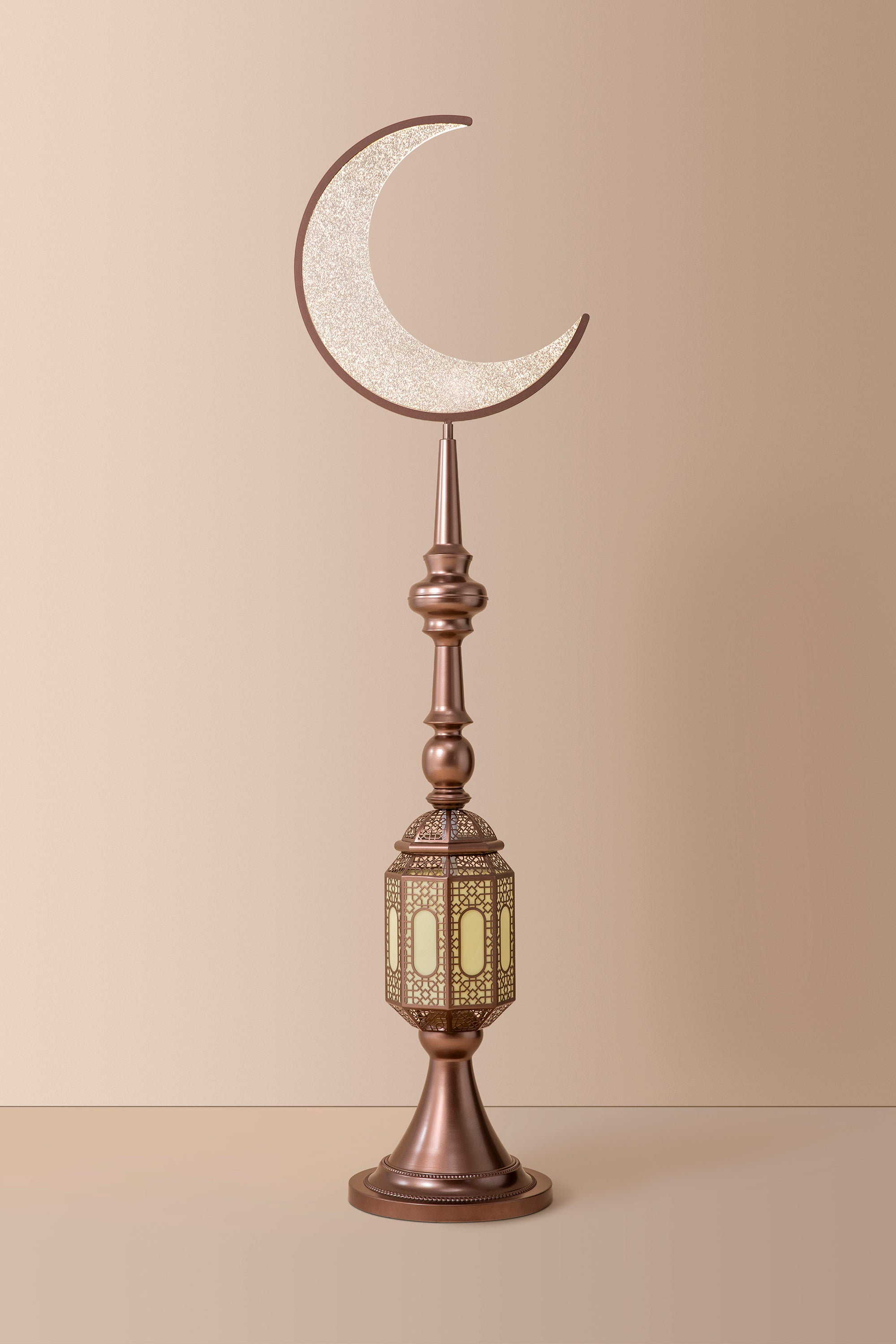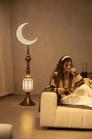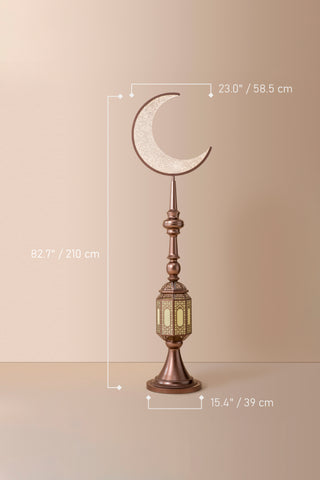 The Hilal Amber Crescent Tower Floor Lamp pairs a warm bronze-gold tone with intricate detailing to bring a luxurious, traditional aesthetic into contemporary interiors. Its gentle golden illumination creates a welcoming and elevated atmosphere.