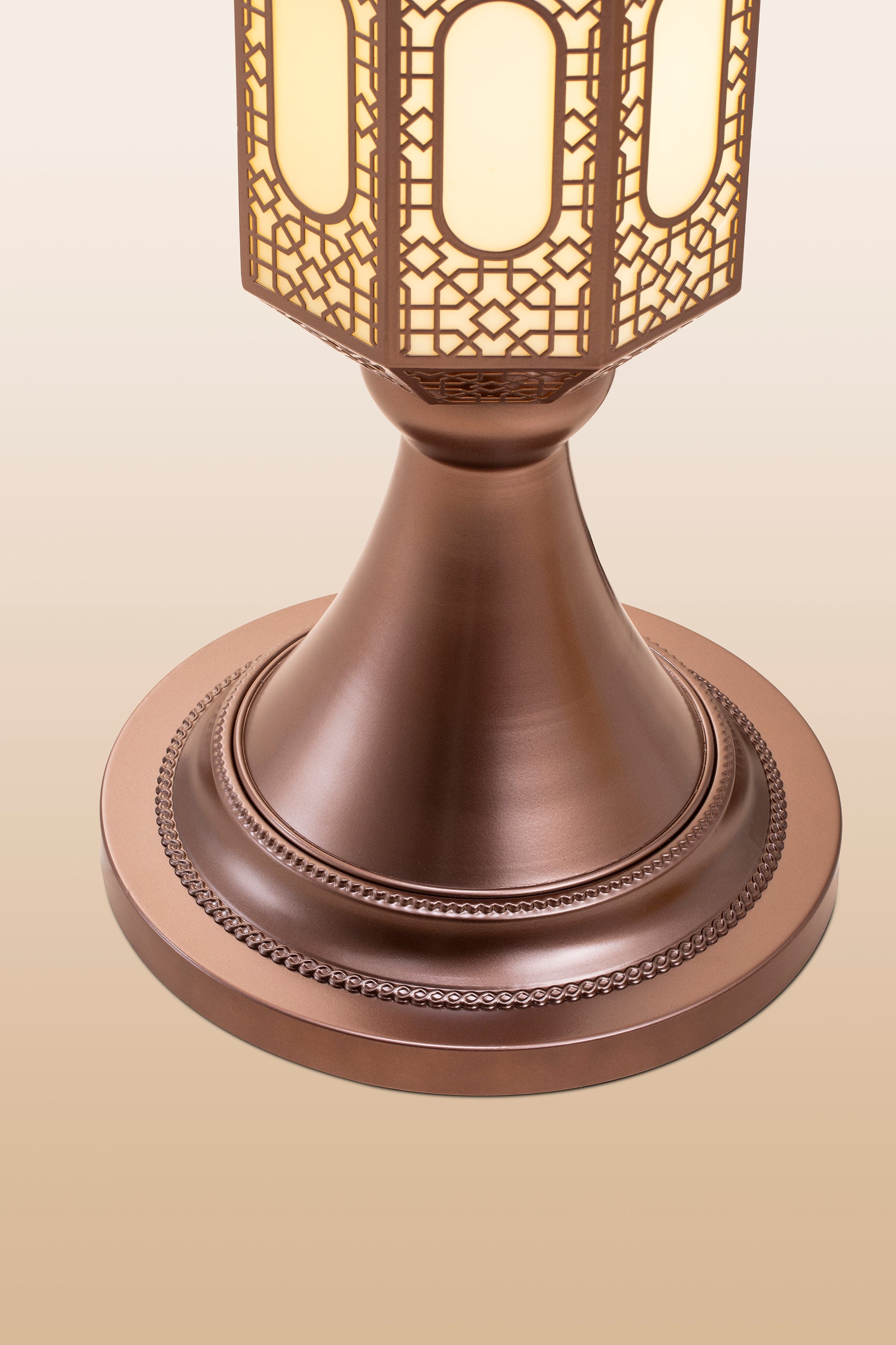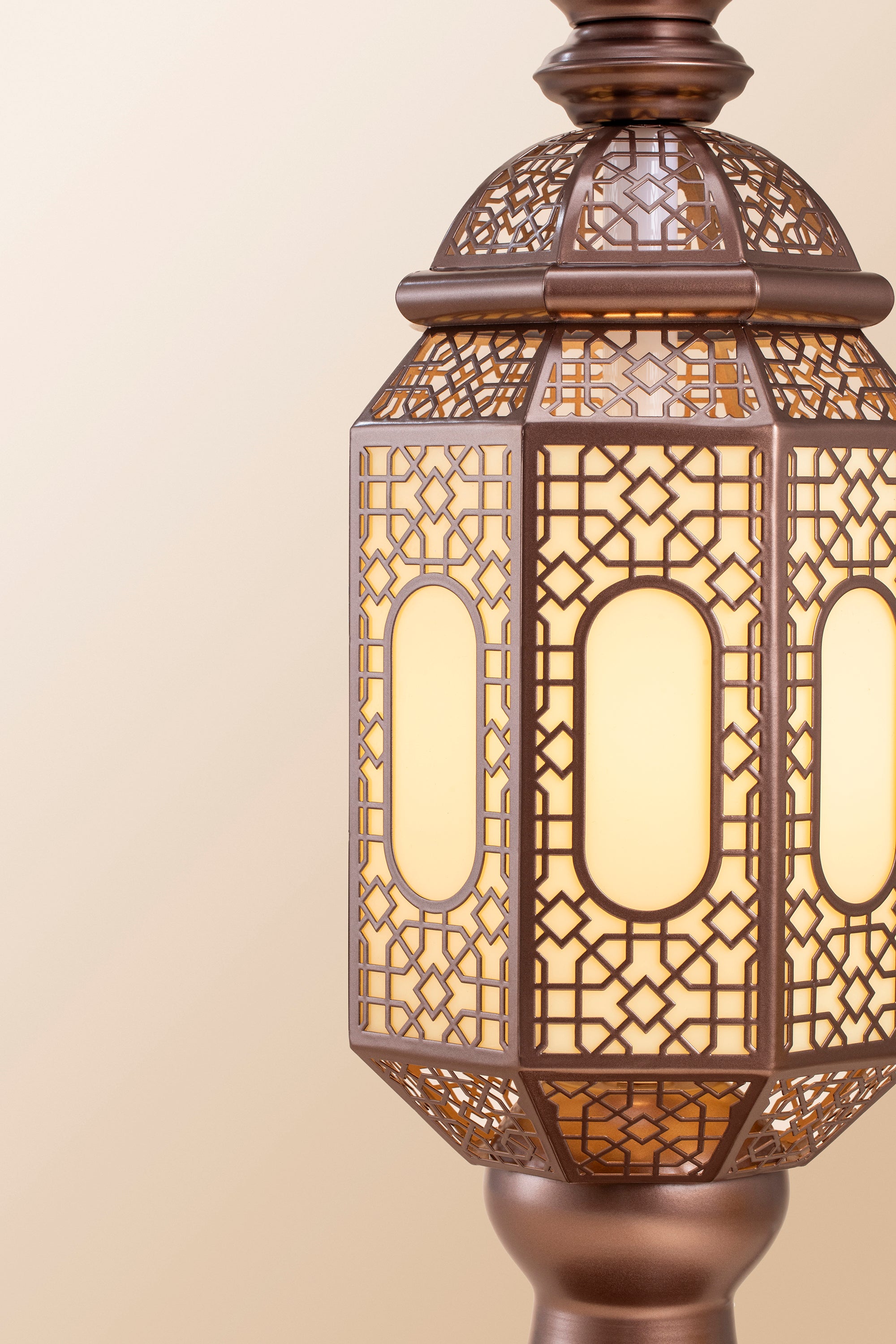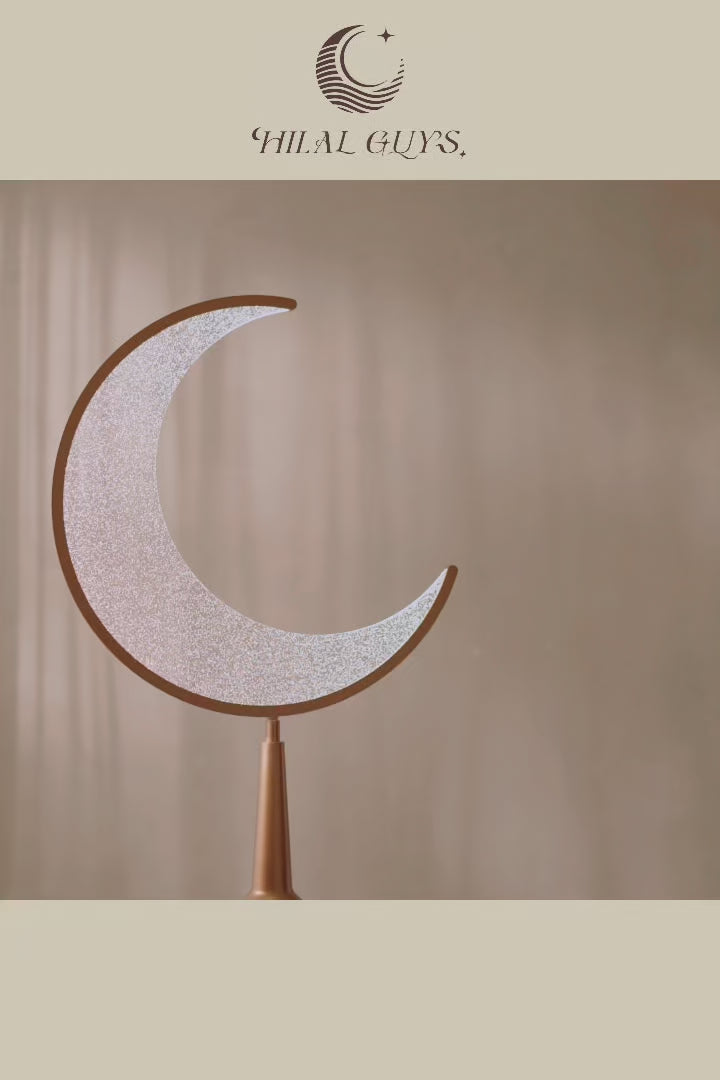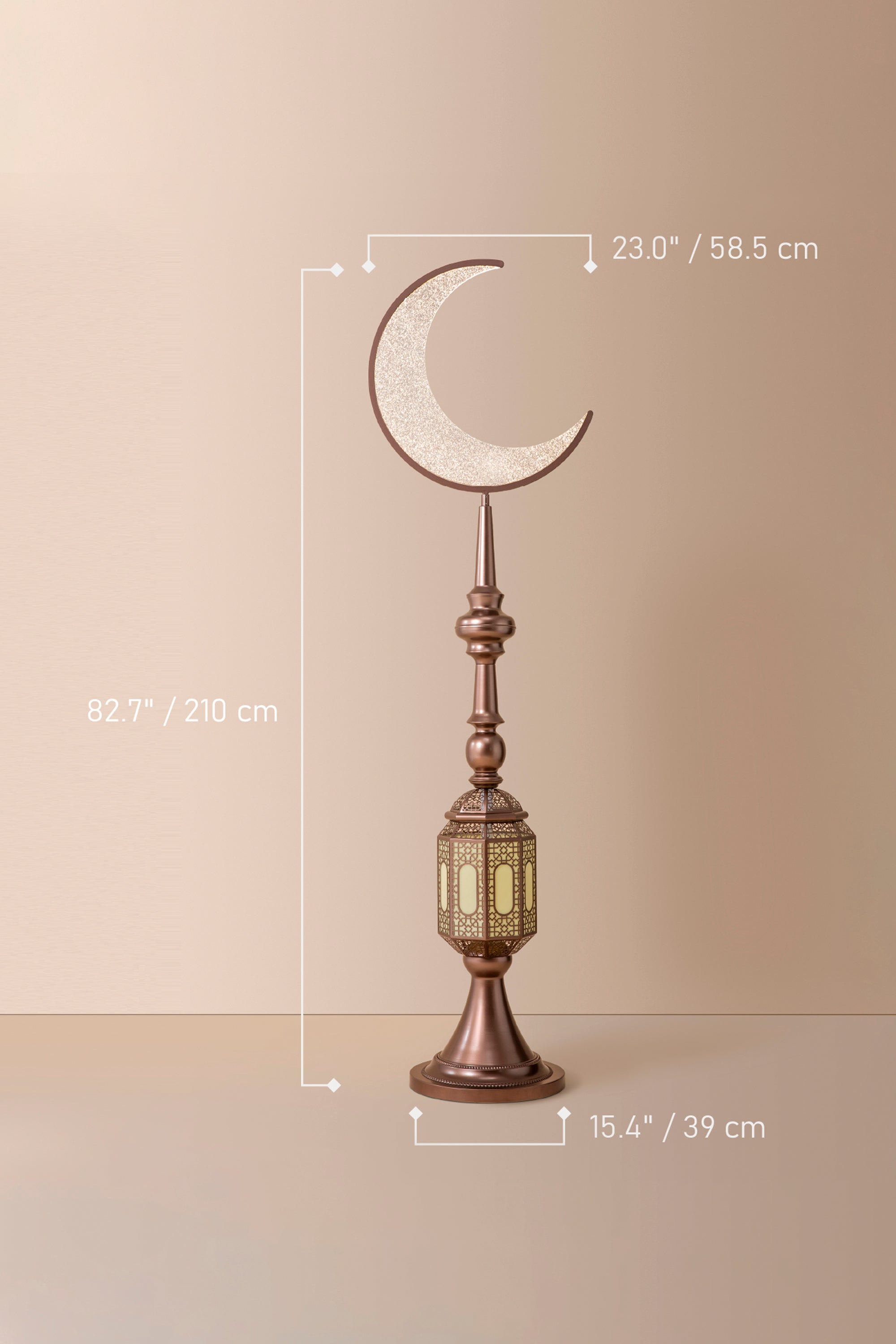 The Hilal Amber Crescent Tower Floor Lamp pairs a warm bronze-gold tone with intricate detailing to bring a luxurious, traditional aesthetic into contemporary interiors. Its gentle golden illumination creates a welcoming and elevated atmosphere.