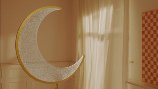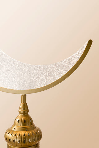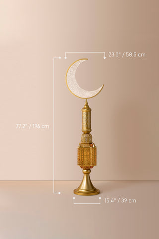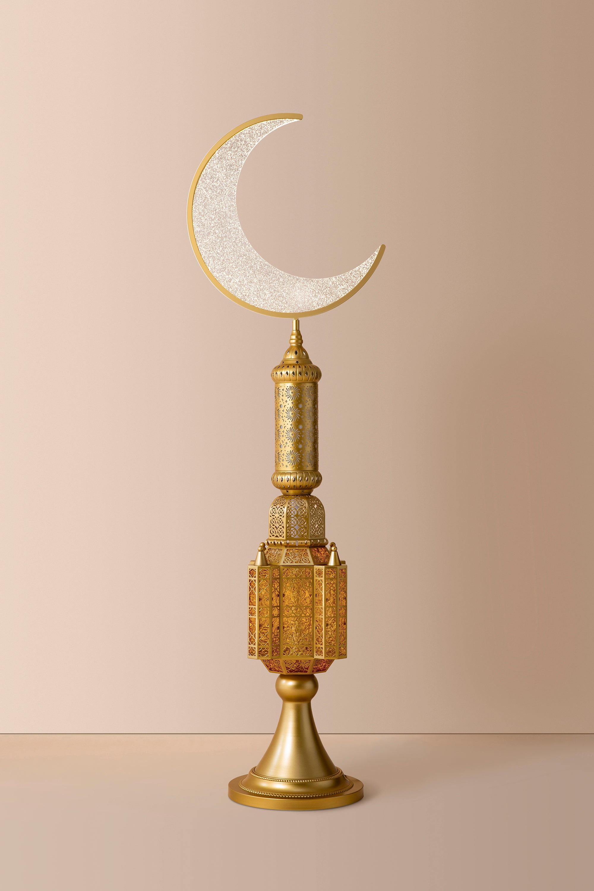 The sculpted crescent crown rests above an intricately patterned lantern base, blending spiritual symbolism with architectural craftsmanship.