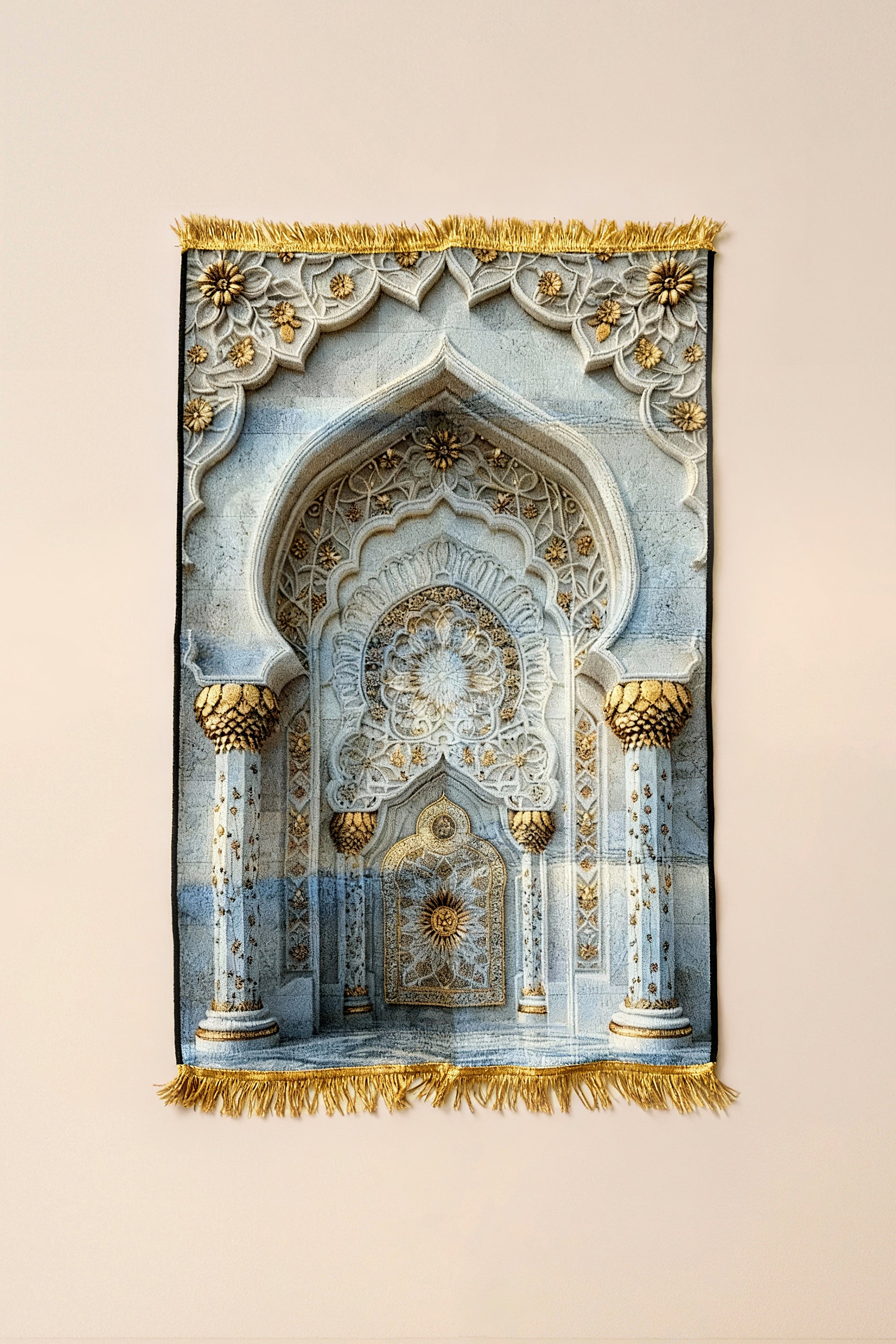 The Sacred Light Prayer Rug embodies purity and divine radiance through its marble-white tones and golden architectural motifs. Each woven detail reflects sacred harmony, inspired by the domes and arches of ancient mosques. Subtle golden threads shimmer under soft light, symbolizing enlightenment and spiritual grace. Designed to invite calm reflection, this rug transforms prayer into an experience of serenity and reverence — where light itself becomes a form of devotion.